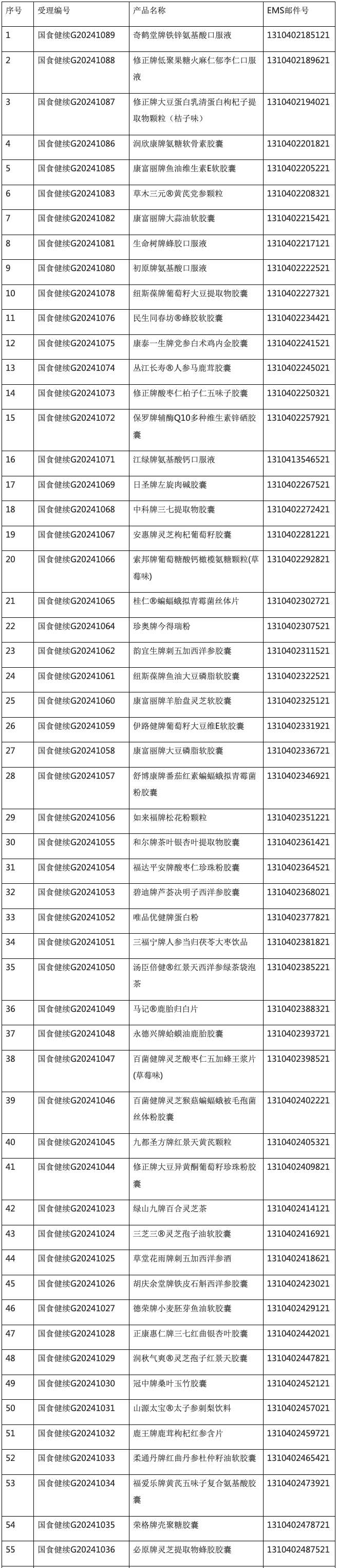 为进一步提高保健食品审评服务质量,推进保健食品全流程电子化申报和审评工作,方便申请人查询审评意见和提交注册申请材料,根据《保健食品注册与备案管理办法》及配套文件的规定,对已在保健食品注册管理信息系统提交电子版申请材料的变更、转让技术、证书补发类保健食品注册申请,发放电子审评意见通知书,同步发放纸质版审评意见通知书(收件地址信息为:申请人在保健食品注册管理信息系统填报的注册申请人地址及联系人、联系电话)。对于以下清单所列产品,申请人可凭注册账号和密码在保健食品注册管理信息系统(网址:https://xbjspzc.gsxt.gov.cn/regist_enter/)查询打印审评意见通知书,按照电子或纸质版审评意见通知书要求,在规定时限内提交补充材料或复审材料。