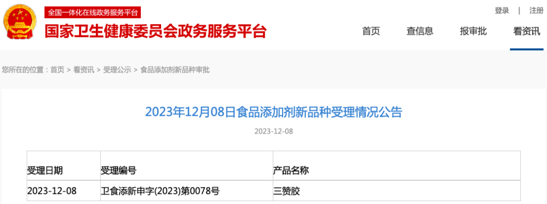 01 产品名称:三赞胶 受理日期:2023-12-08 受理编号:卫食添新申字(2023)第0078号 02 产品名称:富硒酵母 受理日期:2023-12-11 受理编号:卫食添新申字(2023)第0079号