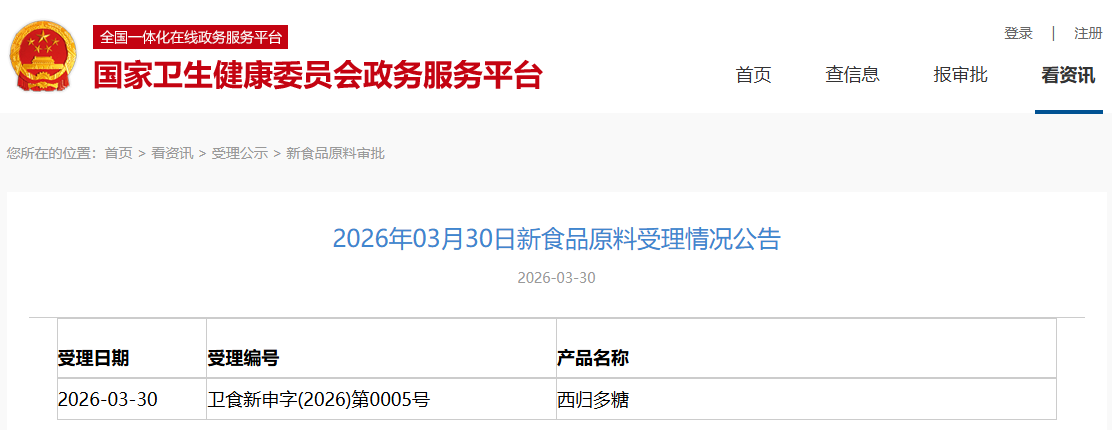 产品名称:西归多糖 受理日期:2026-03-30 受理编号:卫食新申字(2026)第0005号