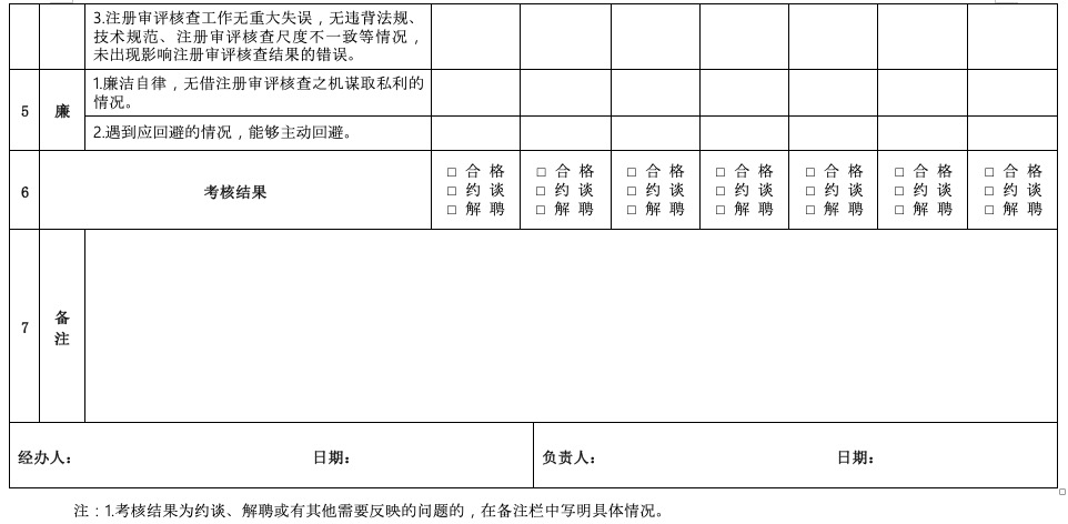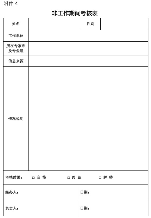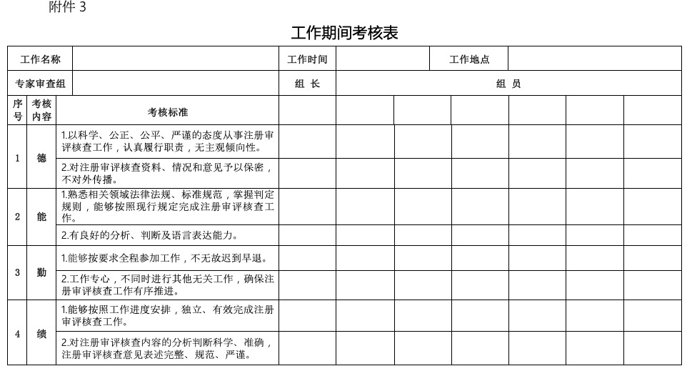 第十九条 食审中心通过工作期间考核表(附件3)对专家在参与注册审评核查工作期间的履职情况进行考核;在专家未参与注册审评核查工作期间,食审中心发现的其注册审评核查意见有误、违规违纪等情况,通过非工作期间考核表(附件4)进行考核。
