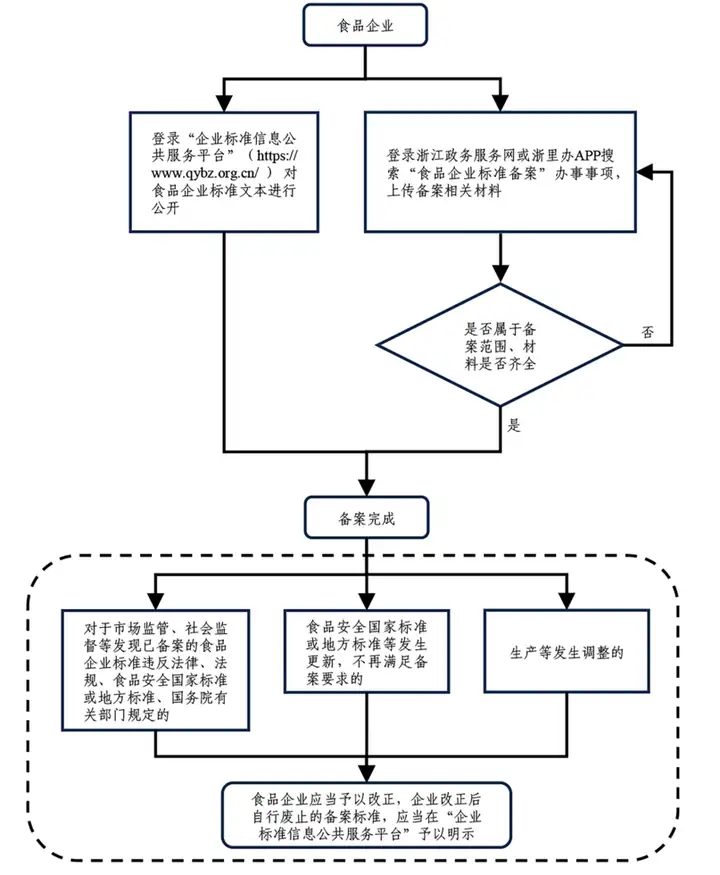 (二)提升备案工作服务效率。我省食品生产企业可登录浙江政务服务网或浙里办APP搜索“食品企业标准备案”办事事项进行线上办理备案,公众可登录“浙江省食品企业标准备案信息系统”(https://spaqbz.wsjkw.zj.gov.cn/zjfsdata/html/pt.htm)免费查阅、下载。各市卫生健康行政部门仅对食品企业标准是否属于备案范围、资料是否齐全进行确认。