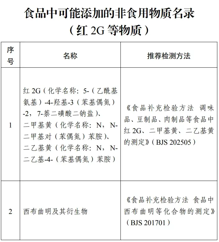 近日,市场监管总局、国家卫生健康委联合发布《关于将红2G等物质纳入食品中可能添加的非食用物质名录的公告》,将红2G、二甲基黄、二乙基黄、西布曲明及其衍生物纳入非食用物质名录。其中,红2G、二甲基黄、二乙基黄为工业染料,可能会被不法商家用于腊肠等食品染色以改善色泽,具有一定健康风险;西布曲明具有神经抑制作用从而达到抑制食欲、减重的效果,但可能引发心律失常等不良反应。名录中同时按规定发布了配套检验方法。