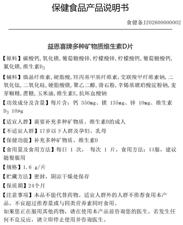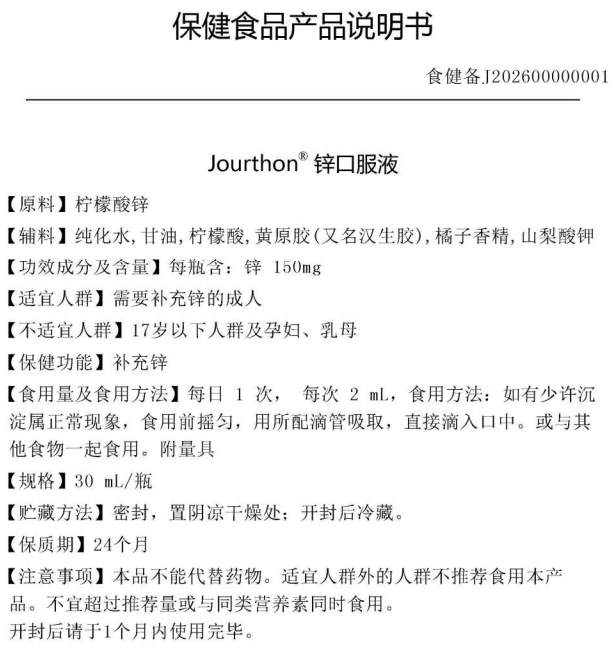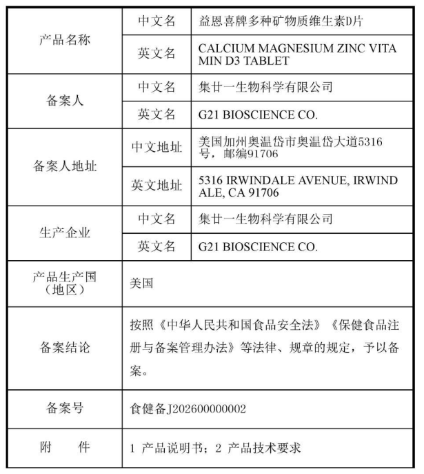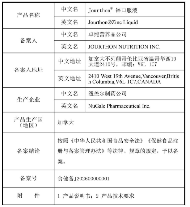 2026年3月18日,国家市场监督管理总局食品审评中心发布了2款进口保健食品备案信息,具体产品信息如下。 Jourthon®锌口服液 食健备J202600000001 益恩喜牌多种矿物质维生素D片 食健备J202600000002