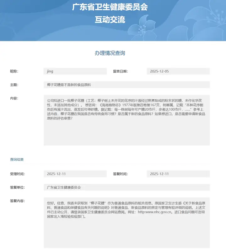 广东卫健委答复:椰子花糖是不是新的食品原料Q 椰子花糖是不是新的食品原料 公司拟进口一批椰子花糖(工艺:椰子树上未开花的花序的汁液经过熬煮制成的粉末状...