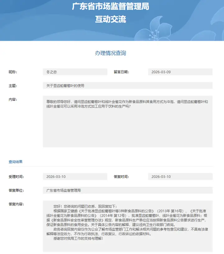 广东市场局答复:关于显齿蛇葡萄叶的使用关于显齿蛇葡萄叶的使用 尊敬的领导您好,请问显齿蛇葡萄叶和线叶金雀花作为新食品原料其食用方式为冲泡,请问...