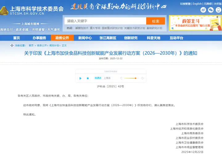 上海发力食品科技新赛道,重点支持新食品原料与特殊食品研发近日,上海市多部门联合印发《上海市加快食品科技创新赋能产业发展行动方案(20262030年)》,明确以科技创新为核心...