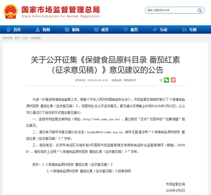 备案原料再添一员!番茄红素拟纳入保健食品备案原料目录(附一图读懂)近日,市场监管总局发布《保健食品原料目录 番茄红素(征求意见稿)》,拟将番茄红素纳入保健食品原料目录,并面...